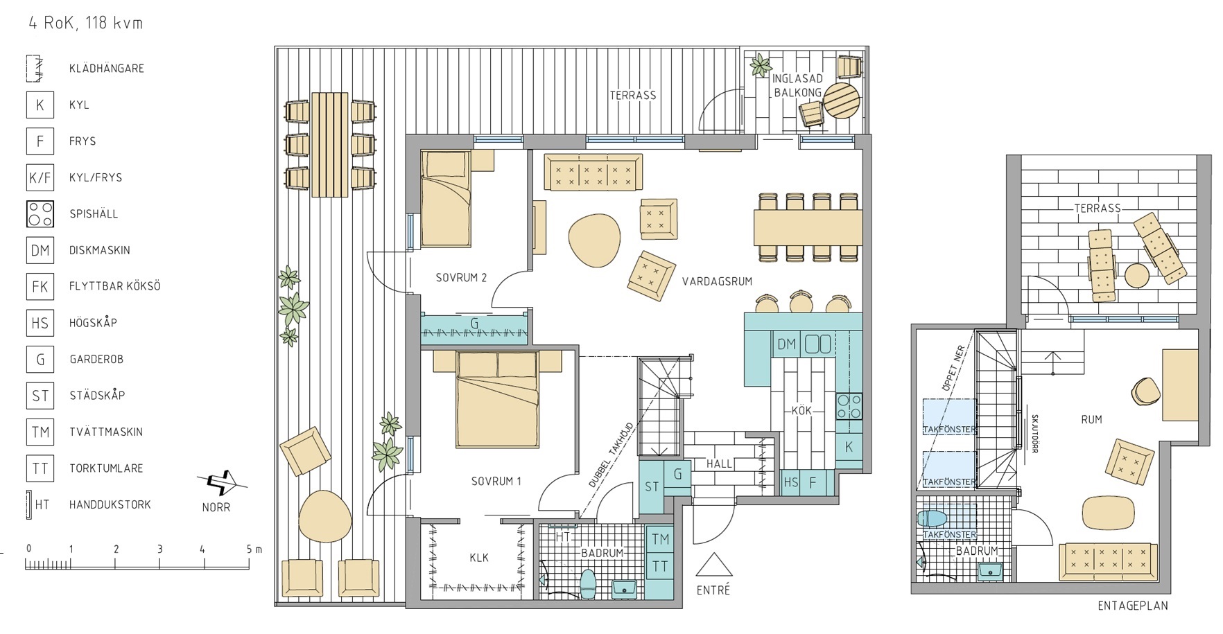 - 4 st 4 rok i etage, ca 118 kvm, med inglasad balkong och takterrass