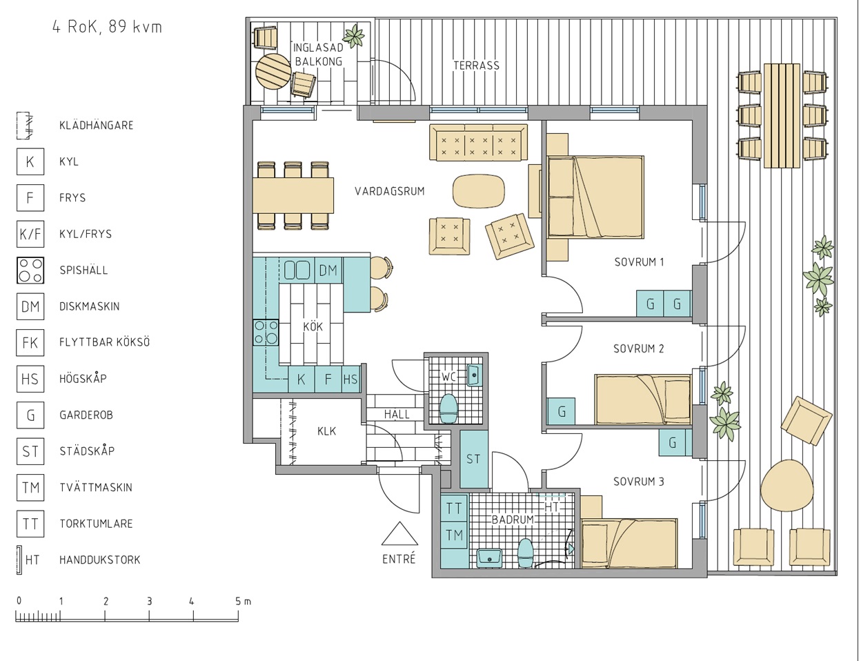 - 4 st 4 rok, ca 89 kvm, med inglasad balkong och takterrass