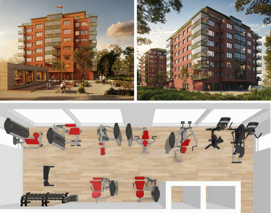 Mellan husen uppförs ett eget gym med kvalitativa maskiner och fria vikter, exklusivt för hyresgästerna. En trivsam och komplett träningsmiljö,
